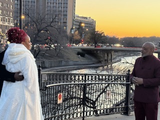 One evening as we walked toward the Sister City bridge that spans Brush Creek, I spotted a lady standing at midpoint, draped in a flowing white cape. Gathered at the bridge’s base were eight others, snapping photos as the woman walked toward the Plaza side.