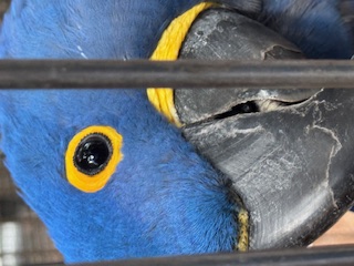 Hidden among the foliage are six-foot-tall metal cages, each housing one or two rainbow feathered macaws or other parrots. Large macaws can easily live fifty years and beyond, so it’s not uncommon for them to outlive their owners. Like many creatures from the wild that people purchase for pets, their needs or their size too often sees them released.