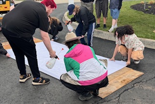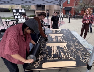 The exact location was by and in the circle drive of Kirkwood Hall. Earlier, students had hand carved artistic designs into 4 X 8 planks of wood then heavily coated them with ink applied from extra-large hand rollers. These boards were then placed on the driveway where more ink was rolled upon them. Next, a white sheet was laid over the plank, followed by a commercial mover’s blanket.