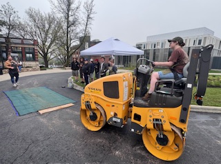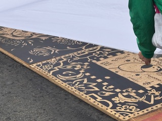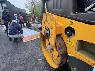 Now the fun began. Atop a professional road paver sat one of the art students, feeling the power of the paver at their feet and finger tips. Giddily they guided the paver over the plank. Within thirty seconds, no boost of throttle required, the process was complete. The blanket was removed and the sheet lifted, revealing a stunning piece of art.