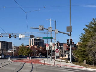 To help keep our band of merry readers informed, Cutest and I road-tested a north-bound street car from the Plaza. Combined with being new and a sunny November Saturday, our car was standing room only. Riders, from smiling kindergarten kids to gray haired grandparents, seemed to be in a jovial mood, as if they were on a new ride at Disneyland. A crowded and rather slow ride. A man who looked to be much older than us offered Cutest his seat. She declined graciously but I know what she was thinking.